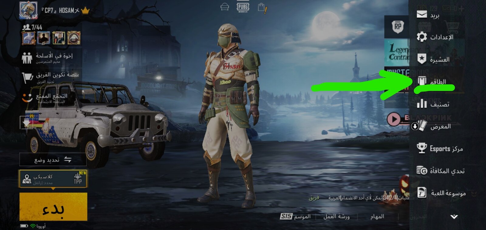 7.ثم ننزل لأسفل الخيارات ونختار بطاقة تغيير الاسم ويتم شرائها بعملات تحدي الطاقم كما هو موضح