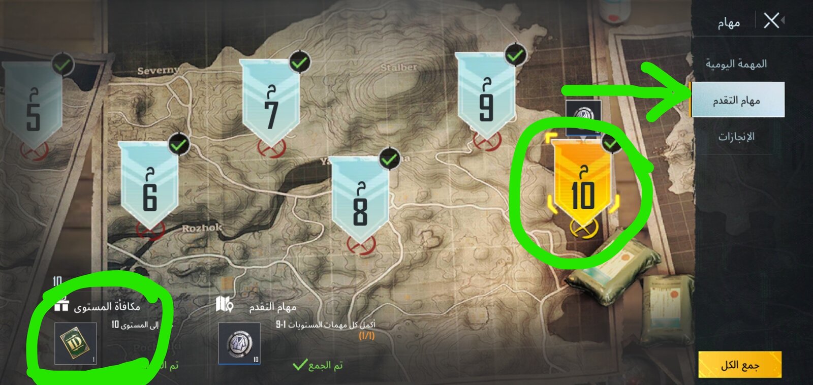 9.ثم نختار خيار مهام التقدم نذهب إلى المستوى 10 من التقدم نجمع الهداية المرفقة والتي من ضمنها تكون بطاقة تغيير الاسم
