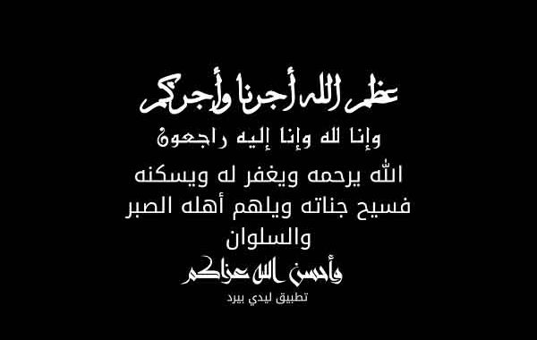 - نيابة عني وعن أسرة المتوفي واقدم لكم الشكر والتعازي فهو التخفيف من الألم الذي نمر به ودعواتكم الصادقة جزاكم الله خيراً ورفع أيديكم للسماء بالدعاء له، اللهم ابدله داراً خيراً من داره وأهلاً خيراً من أهله إنه سبحانه ولي ذلك وقادر عليه.