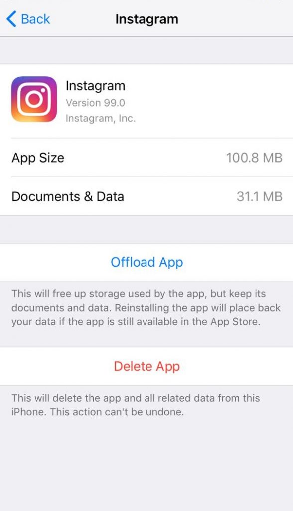 وانتقل لأسفل إلى التطبيقات ، وابحث عن Instagram ، واضغط عليه ؛ سترى زرين. الأول هو إلغاء تحميل التطبيق وحذف التطبيق. اضغط على Offload App لحدف الملفات المؤقتة. لن يؤثر على بياناتك على حسابك ، بل إنها تقوم فقط بإزالة الملفات الإضافية في تطبيقاتك. من خلال النقر على تطبيقات إلغاء التحميل ؛ سيتم إعادة تثبيت التطبيق على جهازك.