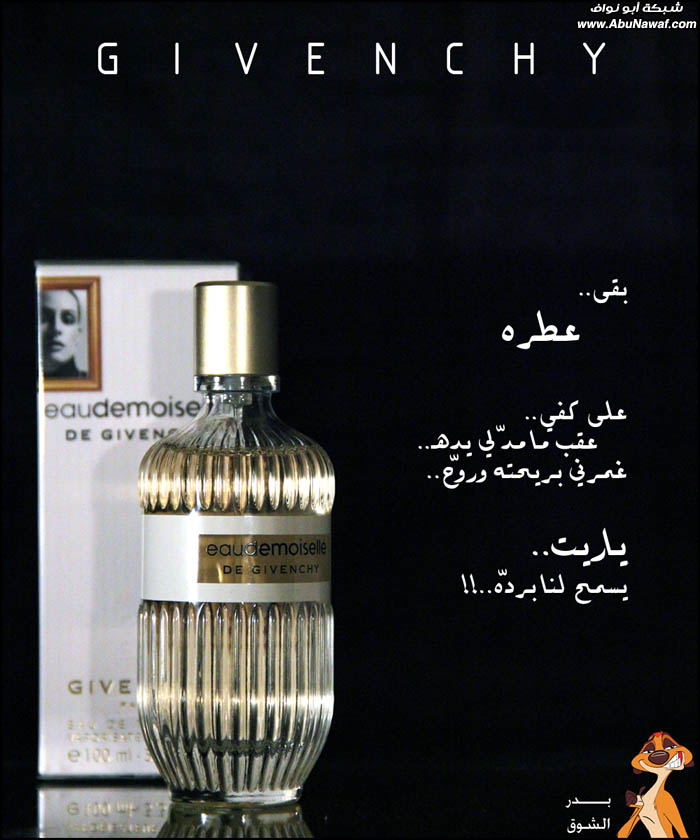 اشم عطره في يدينَـِيْ واخاويه دآمَه بعيَد آليوَمْ عطره بقى لي ساعات اسولف مع يديني واسليه وَ سآعَآتَ تنَزلَ دمعتـِيْ : فيَ سؤآليَ( عطرة )